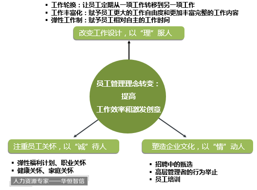 传统的工作设计让员工每天重复同样的工作,既让员工感到枯燥、疲惫和厌倦,同时工作效率低下。因此人们试图通过工作的再设计让工作本身更加具有激励作用。如今工作轮换已经被许多企业所运用,这种工作设计让员工定期从一项工作转移到另一项工作,减少了工作的枯燥和乏味,能够提高员工的工作积极性和工作热情;工作丰富化通过赋予员工更大的工作自由度和独立性和更加丰富和完整的工作内容,让员工通过参与决策感受到自己工作的价值。另一方面,弹性工作制是另一种已经被员工广泛认可和接受的工作安排,它通过赋予员工相对自主的工作时间来提高员工的满意度和工作效率。