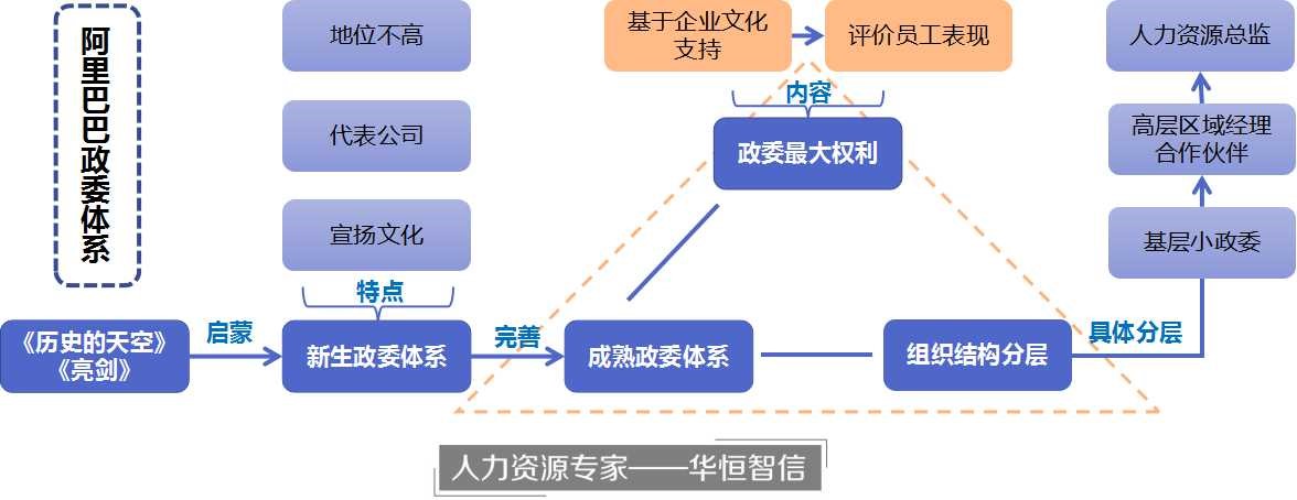 马云将政委体系从组织结构上分三层,最基层的称为“小政委”,分布在具体的城市区域,与区域经理搭档;往上一层是与高级区域经理搭档;再往上直接到了阿里巴巴人力资源总监,或者首席人力资源官。