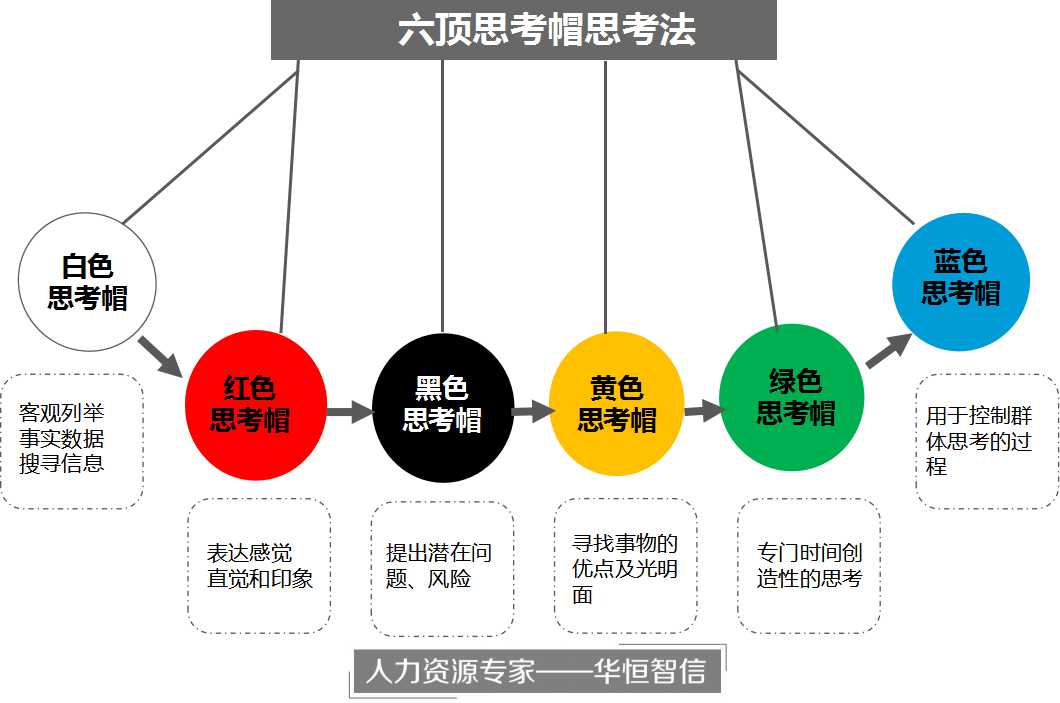 “六顶思考帽思考法”分有白、红、黑、黄、绿、蓝六顶帽子,代表六种不同的思考模式: