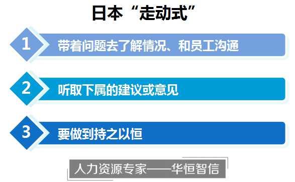 “走动式”是指企业家一马当先,与企业员工打成一片,体察民意,领会真情,共创业绩。“走动式管理”作为经典的经营管理方式值得学习,但怎样利用并同时避免产生副作用则是一门学问。做好“走动式管理”,首先应带着问题走动。高管到基层走动时,一定要提前带着发现问题的眼睛和耳朵去,带着问题去了解情况、和员工沟通才能事半功倍;其次,听取下属的建议或意见,要和下属多加沟通,聆听下属的建议或意见,和他们讨论问题和解决方法:最后,要做到持之以恒,只有持之以恒才能从长期看出这种管理方式对自己的团队是否有效。
