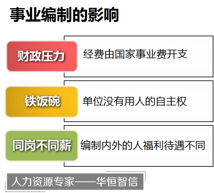 对于中国的事业单位,长期存在的事业编制发挥了稳定人心、促进发展的作用,对企业或是单位来说影响颇深。但是从长远来看也带来了一些问题,尤其是逐步过渡到市场化经济后,在事业单位中,管理者虽然不需发愁企业的经费来源,但却没有用人的自主权;对内部员工也有很大的影响,编制内外员工的同工不同酬,福利待遇、工作保障等都存在不公平的情况。针对事业编制改革,企业该如何应对呢?华恒智信团队经过长期对事业单位做咨询的经验,提出以下几点建议,同时也希望能对其他行业的企业能有所帮助。