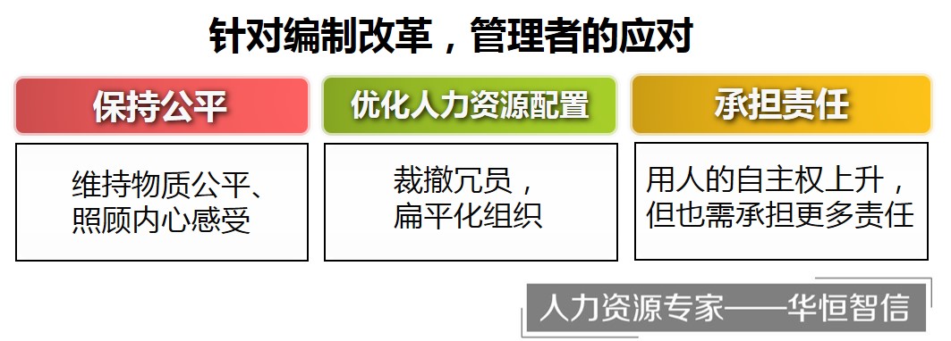 1.管理者应保持相对的内部公平。对很多事业单位而言,都会面临干多干少一个样、吃大锅饭的情况,导致员工进取心不足、管理松懈、工作绩效低等问题。管理者或是HR应逐步实现改革,实行具体措施来建立多劳多得的文化和规范,例如:建立规范,明确奖励和升迁的标准、尽量推行多劳多得的制度。除了维持物质上的公平,企业也应考虑从企业文化等方面入手,创造一个公平公正的企业环境,改变原本由编制决定身份、决定待遇的现象,也能更迅速地适应编制改革。