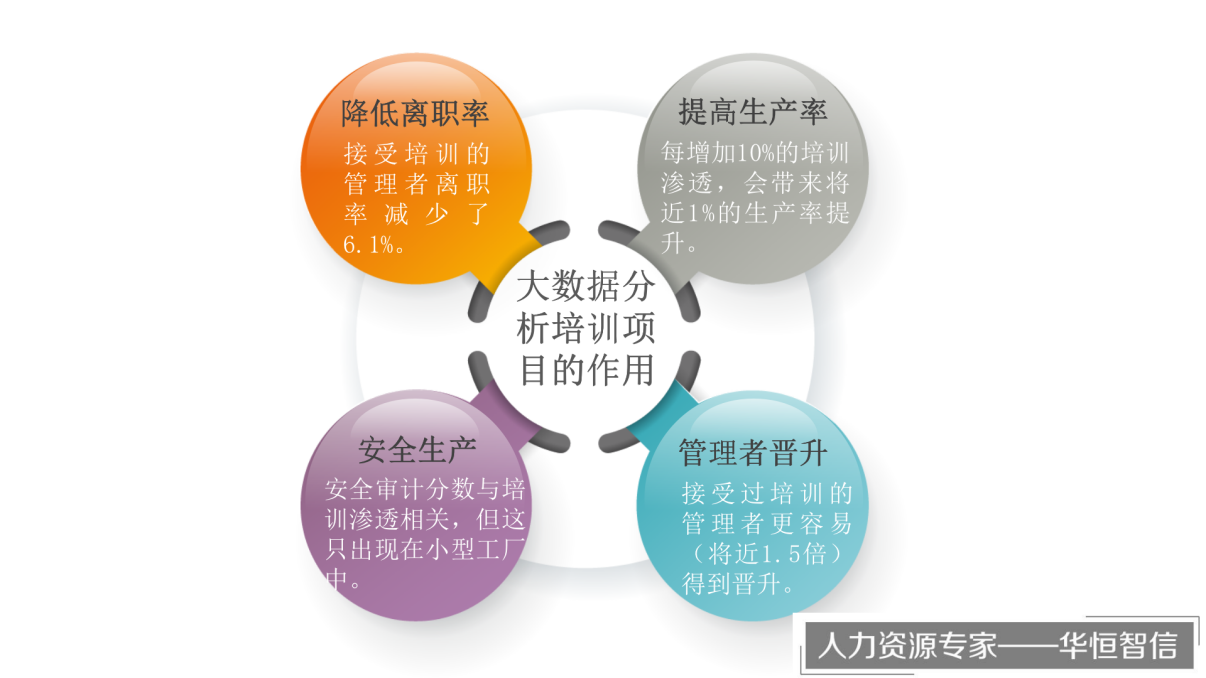 华恒智信在研究中发现CF公司使用人力资源大数据分析来测量领导力开发项目的业务影响很值得我国企业学习借鉴。CF公司是一家国际知名的食品生产商,旗下经营多个品牌,有二十余个品牌在各自的分类中排名第一或第二。为了验证该公司实行的领导力培训的有效性,该公司在两年半的时间里,研究了旗下65家工厂,调查了600名被培训的主管和1600名未参与培训的主管。该研究表明领导力开发项目带来了正向的投资回报率,给工厂和个人绩效都带来了积极影响,并且对主管流失率和保留率也有正面的影响。通过这次分析的结果,CF公司的各级领导可以很自信的说,领导力开发项目取得了成功。企业还可以进一步判断,例如后续项目值得追加150%的资金,但是超过150%,就会得不偿失。基于这些实际的数据,CF公司可以对未来的培训方向和培训计划做出更好的决定。