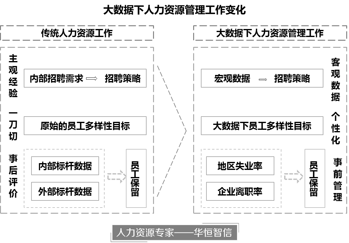 事实上,华恒智信经过长期研究,发现大数据不仅仅可以使用企业的内部数据,而且可以使用外部的宏观数据。例如,在美国的富国银行注意到了宏观数据的价值,通过大数据分析将其从仓库中解放出来,成为企业招聘和人才保留工作的强力支持。
