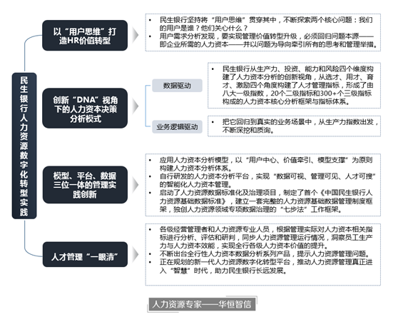 商业银行近两年面对巨大的转型冲击,在经营管理转型过程中,民生银行让人力资源部加入到银行变革转型的前瞻性布局中,利用数字化技术手段,帮助银行洞察环境、洞察对手、洞察自己、洞察人才、洞察未来。