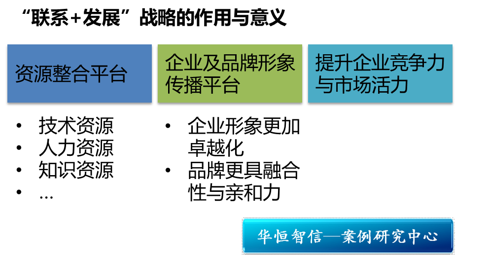 总体来说,宝洁“联系+发展”战略于宝洁自身来说,具有以下三点作用与意义:一是宝洁拥有了一个任何企业都无可比拟的资源整合平台,包括技术资源、人力资源等知识资源等等;二是宝洁也为自己打造了一个企业及品牌形象传播平台,使企业形象更加卓越化,品牌也更具融合性与亲和力;三是宝洁公司通过创新资源的优先占有,可以有效提升企业的竞争力与市场活力,这是企业发展的永恒动力。要知道,企业竞争与营销的本质是资源战,即占有关键性资源与稀缺性资源。