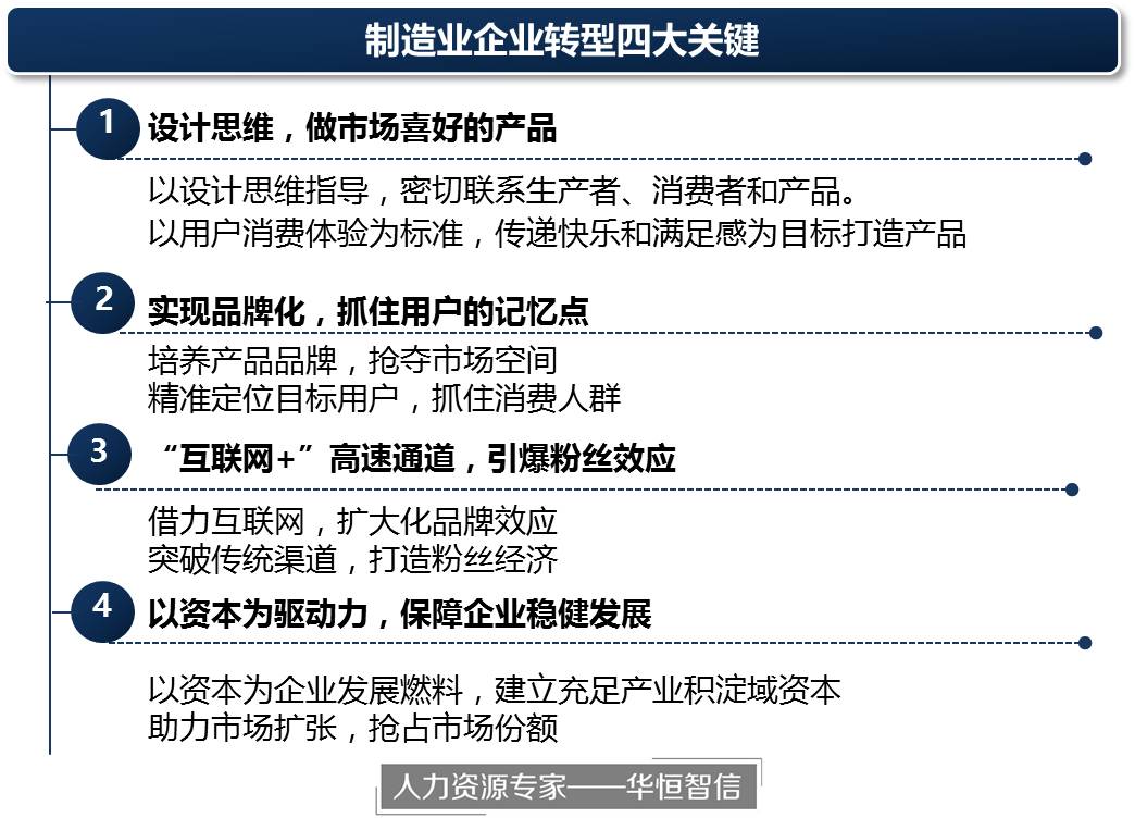 HTC虽然从电子元器件代工厂成功转型为智能手机品牌,但其却一直没有摆脱曾经的代工厂思维。其企业运营思维仍以成本为导向,企业市场定位模糊,企业营销模式亦未迅速抓住市场。从HTC的衰落中,华恒智信认为传统制造企业在转型时可以获得以下启示: