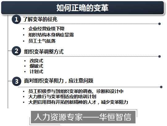首先,变革的征兆,企业领导必须善于调查,发现组织变革的征兆,抓住机遇,及时改革,如果不能及时抓住机遇,重新优化组织架构,决策无法执行,就会错过改革的良机。常见的征兆有: