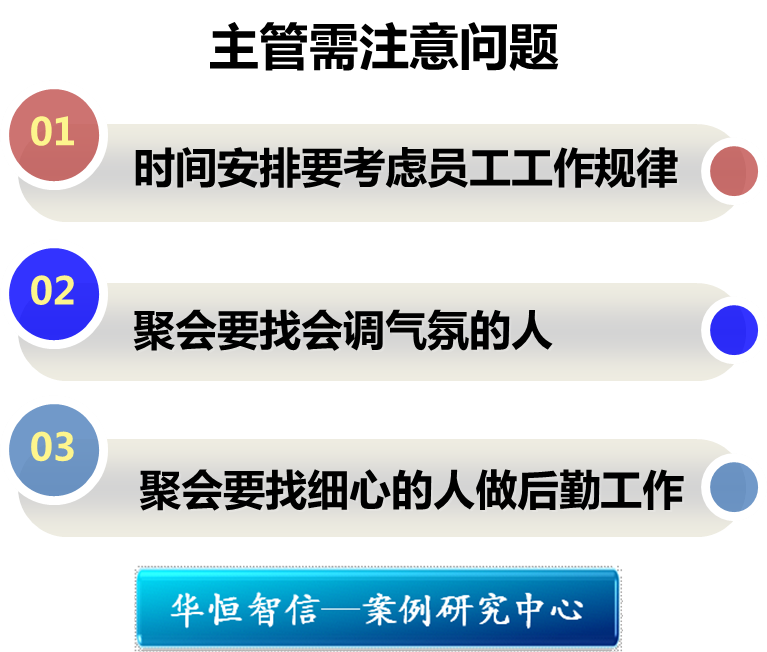 以上是我个人对聚会感悟到的5点好处,但是要想把一个聚会搞好,我们的主管还要注意以下的问题: