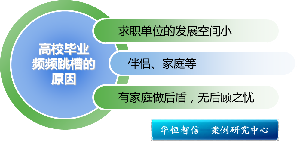 反思高校毕业频频跳槽的原因有很多。首先,很多应届毕业生都嫌求职单位的发展空间小。小张对某地质局的铁饭碗不屑一顾,他说:“在这个部门工作没有达到我期望的任何一点要求:首先,单位有严重的超编现象,面临事业单位改制,可能呆不长久;其次收入太低,1个月才1000多元;第三,我的专业是城市规划和土地经济方面的,他们是工程地质,完全不沾边,我只能做相关法律的科员工作,更没前途。” 其次毕业生们各有理由,为了恋人、家人。去年毕业于武汉理工大学自动化专业的小邹一脸甜蜜地说:“我是为了迁就男朋友才一路从荆州跟到了广州。” 一位新闻系硕士小陈说:“我是一个比较恋家的人,家里只有我一个孩子,在外面工作他们不放心,我也不放心他们,毕竟父母年纪大了。” 另外,现在的毕业生都有家庭做后盾,自己没有任何无后顾之忧。他们从小就生活在一个不需要自己为家庭奔波,为父母操心的状态之中,也很难想象需要挑起家庭重任的感觉。他们在父母和社会的安排之下,一路畅通地走进校园,又顺顺利利地毕业了。没有经济上的压力,这些习惯了有家庭作坚强后盾的孩子们认为“问题并不存在”,于是就可以没有任何顾虑的跳槽再跳槽。