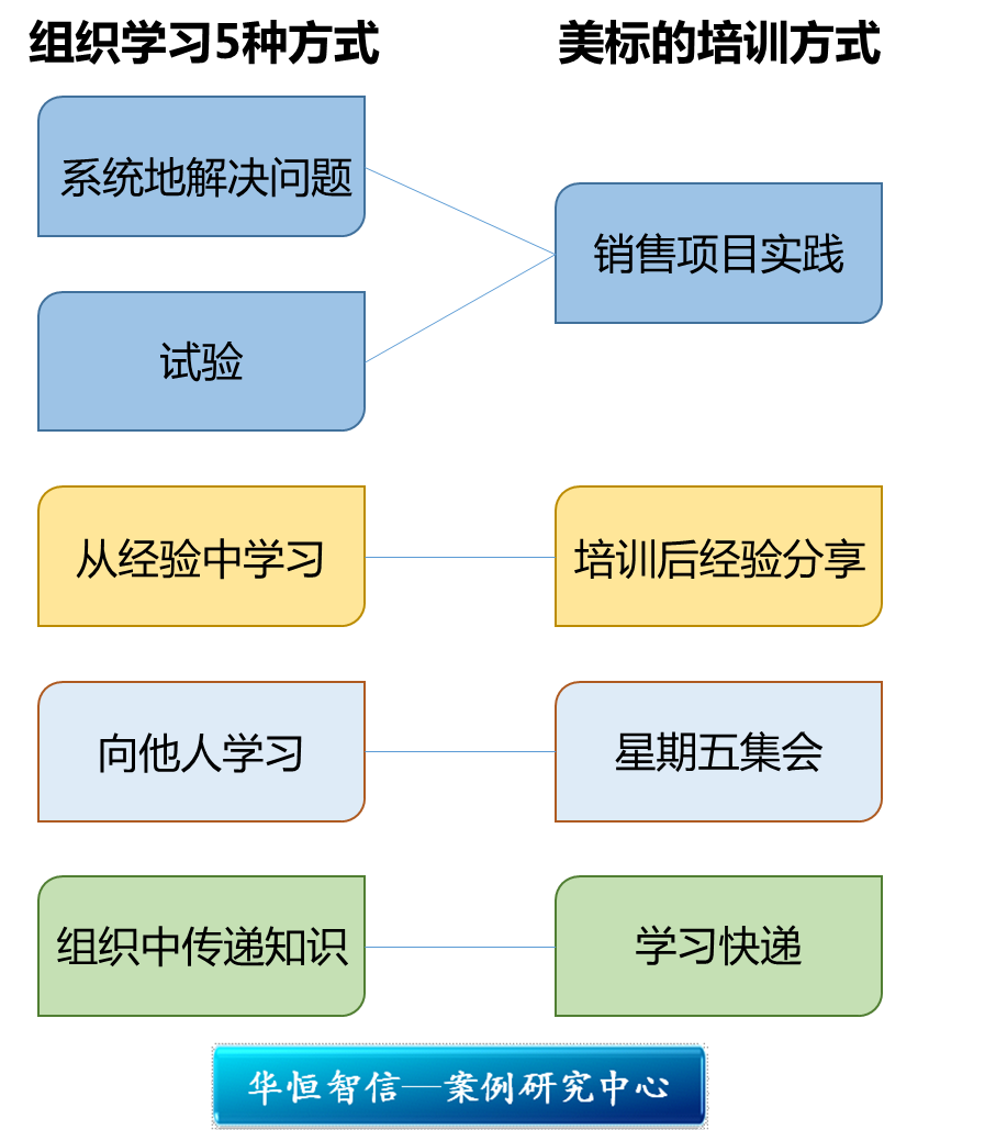结合以上五种组织学习的方式,美标设计了不同的培训方式与沟通形式,以获得最佳的学习效果。