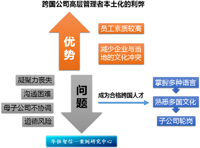 跨国公司面临的最大的难题就是对于高层的管理人员的选用,是实行本土化还是采用公司选派的方式。采用本土的管理人员进行经营,很大的好处