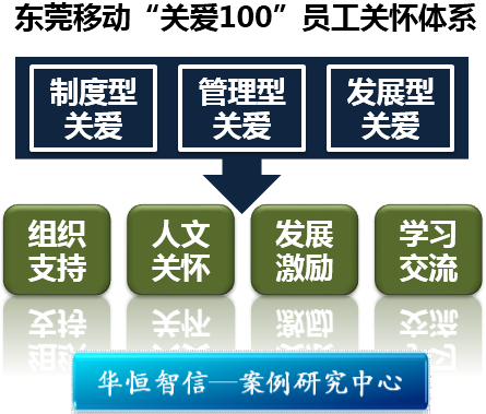 “关爱100”员工关怀体系项目作为实施“和谐动力,活力东莞”的重点工作,出发点和落脚点表现在尊重人的价值、注重人的管理、协调人的关系、激励人的情绪、关心人的“冷暖”和重视人的发展六个方面。基于此,东莞移动从四个维度着