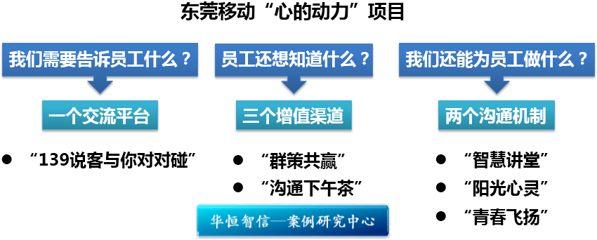 我们需要告诉员工什么?员工还想知道什么?我们还能为员工做什么?心的动力以这三个问题为核心,开展“一个交流平台,两个沟通机制,三个增值渠道”即“123行动”。