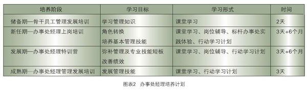 基于这一现实,我们结合公司人才梯队规划,根据培养对象所处的不同阶段及能力表现差异,进行了针对性的培养。“办事处经理培养项目”共分四个阶段:储备期、新任期、发展期、成熟期(见图表2)。储备期培训由分公司负责实施,后三阶段由总部培训发展部组织实施。
