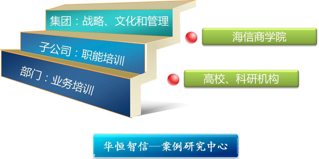海信内部培训范围广泛,层次分明,目前已经形成比较完善、健全的培训机制。海信的培训体系大致分为集团级和直属子公司级两个级别。集团级培训直接和企业战略相关,关注核心人力资源群体,侧重在职干部的提升性培训、企业文化培训、经营管理知识培训、专业知识和技能培训、新员工培训和海外人才的国际化培训;直属子公司级培训直接和业务职能相关,侧重专项业务技能培训。通过不同层次的培训,使不同等级的员工培训都能接受到员工培训,效果也格外明显。