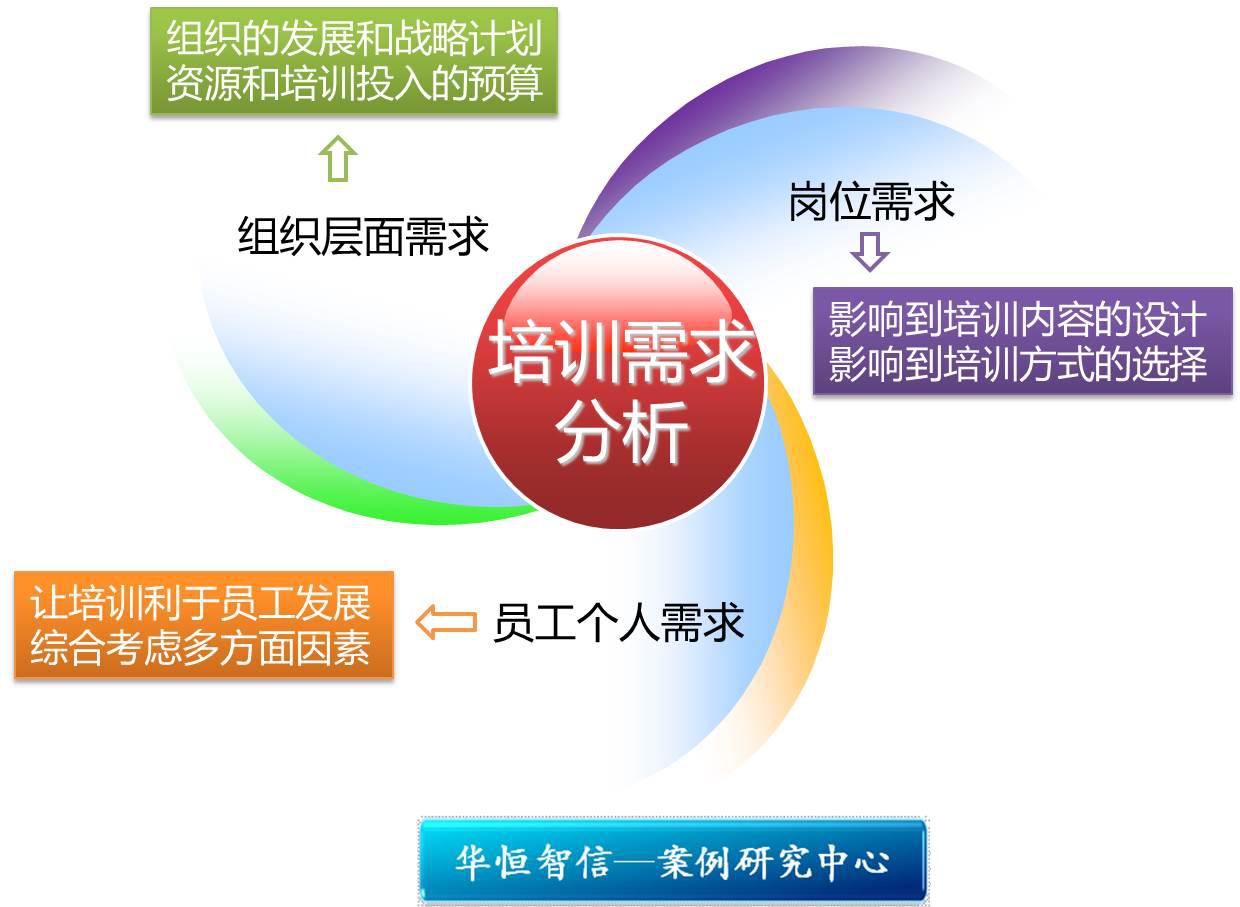 针对培训体系,华恒智信认为,在一个科学的培训体系的八个方面内容中,培训需求分析是整个培训体系建设的基础。只有明确了培训需求,才能找准整个培训计划的落脚点,最终使培训效果落到实处。一个有效的培训体系,需要即考虑到企业发展的需求,又满足员工的岗位和个人对培训的需求。因此,培训需求分析需要综合考虑组织层面需求,岗位需求和员工个人需求三个层面。