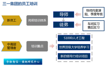 中高层管理人员起着承上启下的作用,这些人员是企业培训的重点。相对其他企业,三一更注重对潜力员工的培训力度。2010年,它实施了“S1000人才工程”,从中挑选出有潜力的优秀员工脱产成班,进行为期三个月的学习,帮助他们快速成长为合格的后备干部。今年,公司还在开发一系列新的领导力培训项目,进一步加速优秀员工的素质提升。它还注重借助外部顶尖的培训资源来武装员工的头脑。除了选择输送国内名校就读外,2011年,三一启动了“世界顶级大学培养学习”计划,从集团的制造、工艺体系选取有潜力的员工,送到世界顶级大学培养。