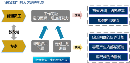 “教父制”的人才培养机制,就是通常而言的企业“导师制”人才培养方式。导师制的培养方式能够节省培训、培养成本,加强内部交流,让新人少走弯路。但是这种方式运用不当也容易产生一些问题。华恒智信认为,导师制的使用需要避免以下几个问题: