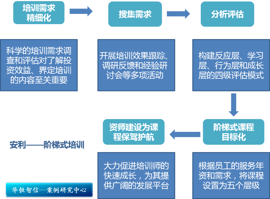 经过几年的摸索和努力,目前,安利阶梯式培训已经搭建了较完整的培训运作链——从搜集员工需求、对需求进行分析评估、课程的规划制作及执行,到检验培训效果等都有了一整套较为科学的流程。