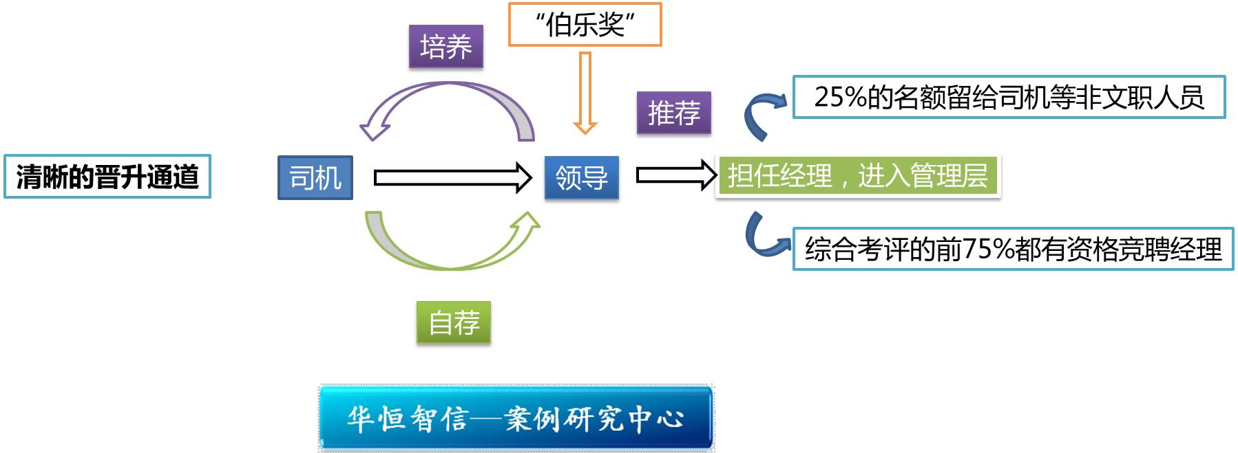 随后的晋升制度和通道也非常清晰,首先是通过自荐或者经理推荐成为储备干部,这其中有至少25%的名额会留给司机等非文职人员,对储备干部进行培训后,综合考评的前75%都有资格竞聘经理,然后通过面谈、辩论等,就有望走上管理层的工作岗位。