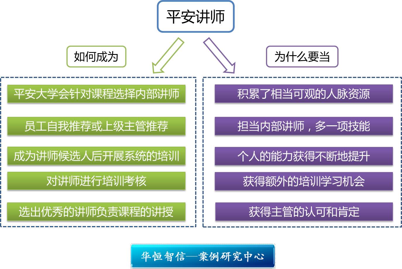 对于内部讲师是如何激励的呢?通过和平安大学资深讲师张老师的交流,我们了解到平安是这么做的:第一,内部讲师通过授课经历接触了大量的平安人,积累了相当可观的人脉资源,为日后的工作生活带来一些意想不到的收获;第二,通过担当内部讲师,这些员工又多了一项技能,可谓说“技多不压身”;第三,通过组织开展培训,个人的能力获得不断地提升;第四,获得额外的培训机会;第五,在所在部门的培训中优先获得学习机会;第六,获得主管的认可和肯定。