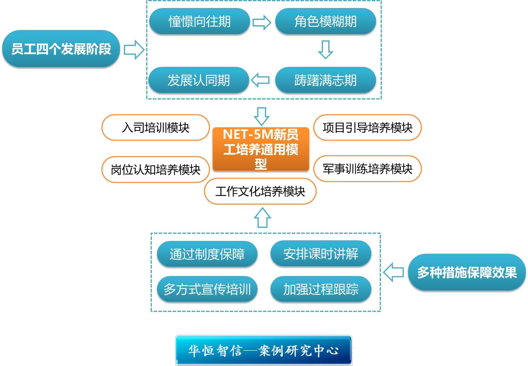 “NET-5M”即“新员工二年期五模块(New Employees Two Years-5 Modules)”,具体是指新员工入公司后2年内,经过逻辑严密、循序渐进的入司培训、岗位认知培养、工作文化培养、军事训练以及项目引导培养这5个模块的系统培养,使其从一个大学生快速成长为一名职业人。