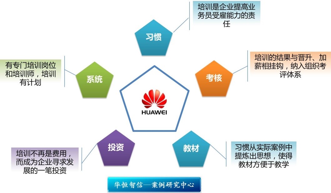 4)华为培训的教材自己编写。主要有《华为新员工文化培训专题教材》,《优秀客户经历模型》,还有有关华为产品和技术的培训各种材料。教材自己编写,习惯从实际案例中提炼出思想,使得教材方便于教学。