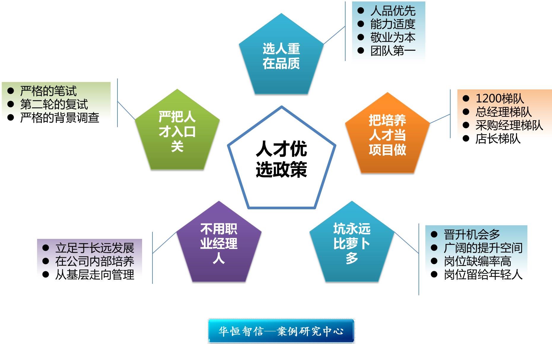 苏宁招人讲究“严进”,每个应聘苏宁的人,都要通过严格的笔试,并且至少要经过3至6位考官的两轮面试。第一轮面试主要由人力资源部门考察应聘者的基本情况和综合素质;第二轮的复试由人力资源部门与用人部门共同完成。比如苏宁在招聘营销人员时,首先由人力资源部对应聘者的人品、逻辑思维能力、职业意向和价值取向进行全面了解,然后考察应聘者相关专业背景和技能,并与用人部门探讨评估,达成基本共识。另外,有幸闯过面试关的人,还要接受严格的背景调查,有不良个人记录的人,将被挡在苏宁的大门外。总体来说,中层干部的录用率只有4%~6%,应届本科生的录用率只有5%~8%。