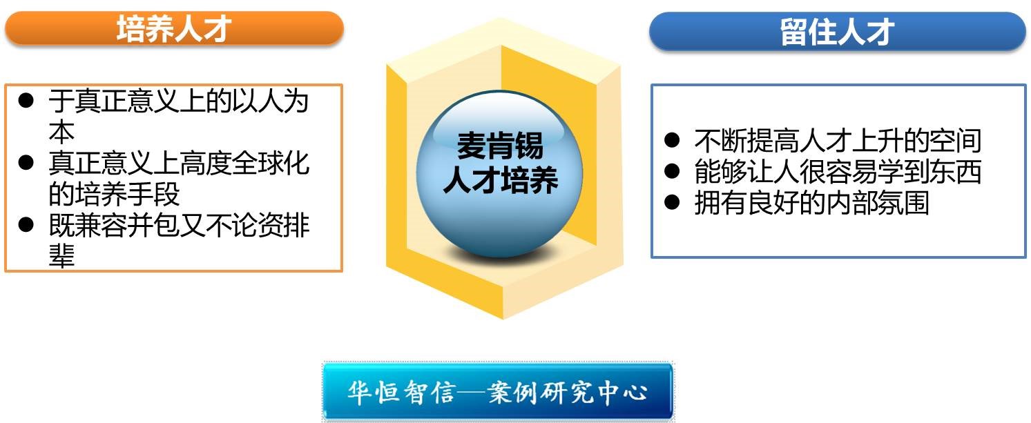 从育人上来讲,麦肯锡思考的问题是如何最大限度的发挥员工潜力,为此它制定了全球最好的人才培训计划。这种高要求和麦肯锡企业本身的特点密不可分。因为咨询业需要面对各行各业的各种问题,而解决这些问题的人只有具备更多的能力,才能在工作中游刃有余,才能撑起企业的发展。也正因如此,企业需要将人才培育贯穿始终,从而为员工增能,使其为企业创造更多的价值。