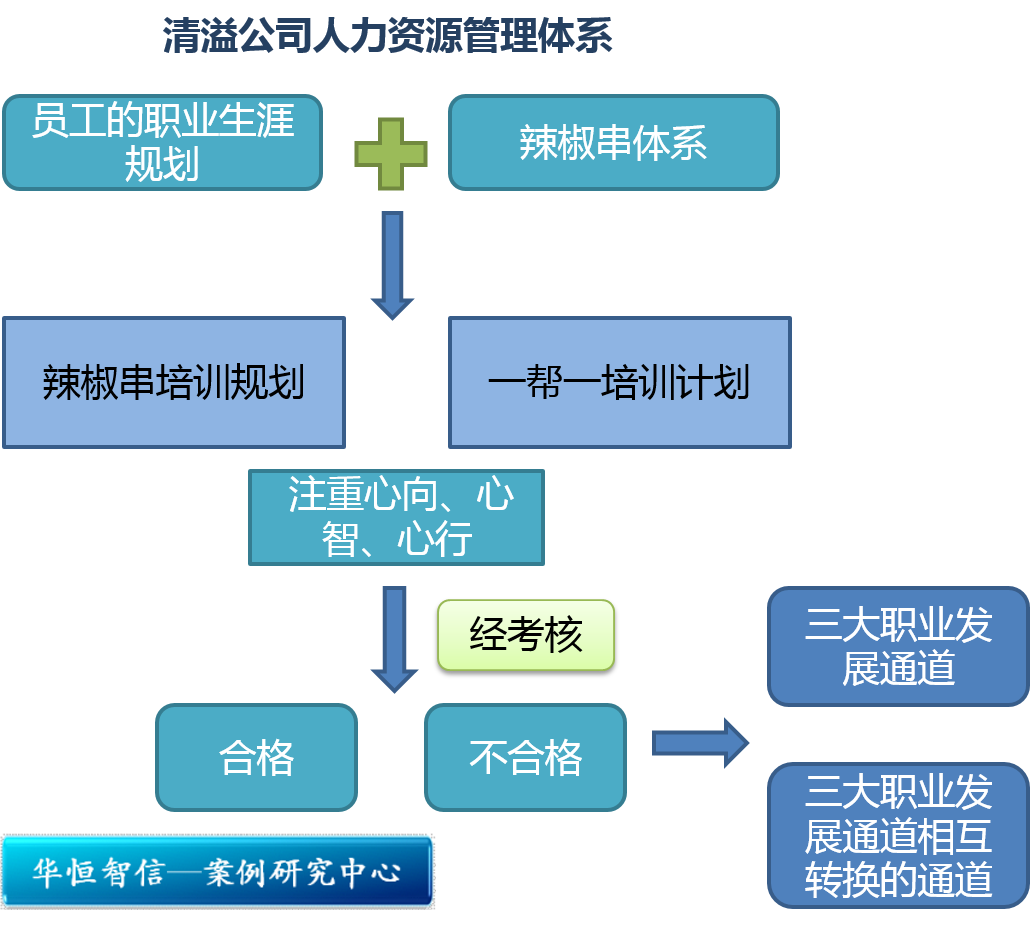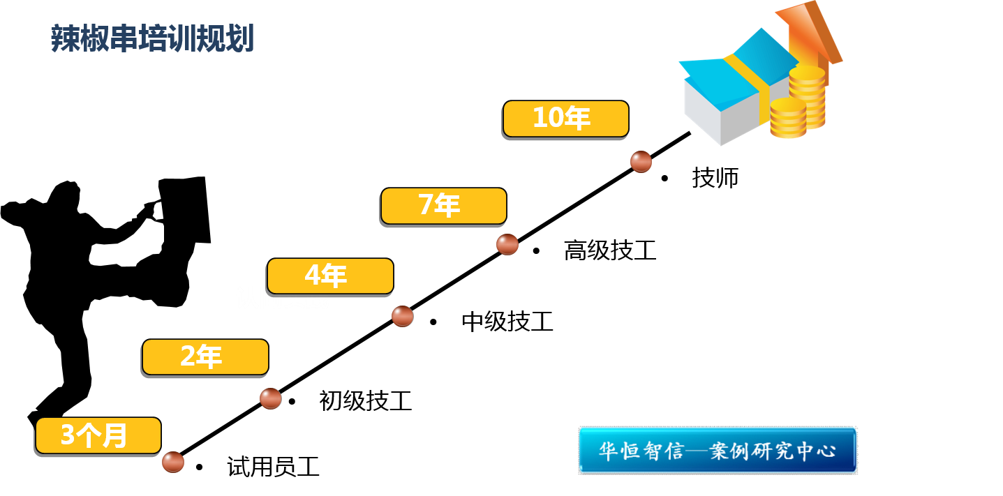 在清溢公司人力资源管理体系中最引人注目的是清溢员工的职业生涯规划和辣椒串培训体系的融合。为贯彻这一体系,从新员工招聘选拔就引用了一些测评工具和方法进行识别,对不认同公司的价值观、不合群、缺乏团队精神的员工进行首次淘汰;进入公司后,公司根据员工的性格特点、爱好、特长为员工作职业规划和根据员工的职业规划为员工制定出了相同岗位统一的辣椒串培训规划和结合不同员工的素质现状制定个性化的一帮一的培训计划。所谓辣椒串培训规划是指用横坐标表示员工的工作时间,纵坐标表示员工的职业发展途径,在横坐标和纵坐标夹角的平分线上把每个员工工作不同时间(如3个月、2年、4年、7年、10年等)能达到的岗位级别(如试用员工、初级技工、中级技工、高级技工、技师、高级技师)需要接受的培训项目一一展现出来,从整个图形上看,就像悬挂着的一串辣椒,清溢公司把这种员工职业生涯规划和培训规划相结合的培训体系称做辣椒串培训体系。