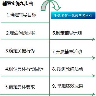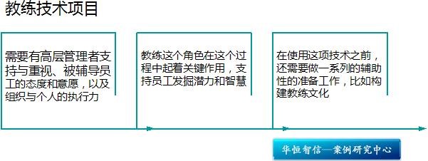 其次,教练这个角色在这个过程中起着关键作用,但教练不是顾问,不是老师,不是心理医生,他是支持你发掘自己的潜力和智慧的人。要成为卓越的教练,华恒智信认为需要掌握的一些基本技能包括:聆听被辅导者说话背后的本心、事实、真相、感受、情绪;态度客观,要抛开自己的判断和看法;能通过发问发掘被辅导者的心态,让对方找出自己的方法去解决问题;能帮助对方看到自己的心态、固有信念和处事模式;让被教练者清楚“镜子”里的自我,看到自己的方向和偏差等。教练的导向作用很明显,如果教练不合格,很可能导致被辅导者南辕北辙。比如案例中的《训练技术》课程培训,实际就是对教练进行培训,让其掌握一些相关的技能。