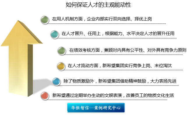 5、系统的教育培训和终身学习制度。新希望认为,要做“百年老店”,必须重视员工的教育培训。在新希望,员工培训不是一种支出,而是一种有益的投资。培训可以改进员工技能,培养良好的工作习惯,降低时间成本和错误成本,从而产生较佳的绩效,“从平凡人身上得到不平凡的结果”。新希望集团教育培训体系以满足工作需求为目的,面向全体员工,以“做什么,学什么”、“缺什么,补什么”为指导,以“提高员工技能”、“挖掘员工潜能”为重要内容,因时、因地、因情地培训员工,通过员工素质和能力的提高,尽快使培训效果转化为生产力,达到提高劳动生产率、增强企业活力的效果。