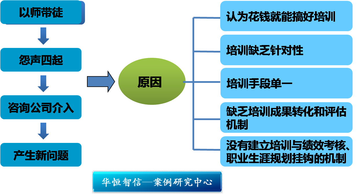 我们照做,最开始效果还不错,干部的责任心有所提高,有的车间甚至自己办起了培训班,呈现出一片可喜景象。但是时间一长,又出现了新问题,基层干部看起来责任心挺强,但车间工作效率总是提不上来,生产事故时有发生。于是,我们决定停课,处理目前各种事故问题,但咨询公司坚持建议要求我们继续坚持按照原来的培训方案。无奈,我们又按“药方”开展培训。但是又出现了员工培训时睡觉甚至是逃课等情况,更绝的是,派去各机构和同行业企业深造的“苗子”回来后不到一个月就跳槽了,这让老总大为恼火,却也无可奈何。细算一下,用于培训的投入已不下于百万,但为什么会是如此的效果呢?