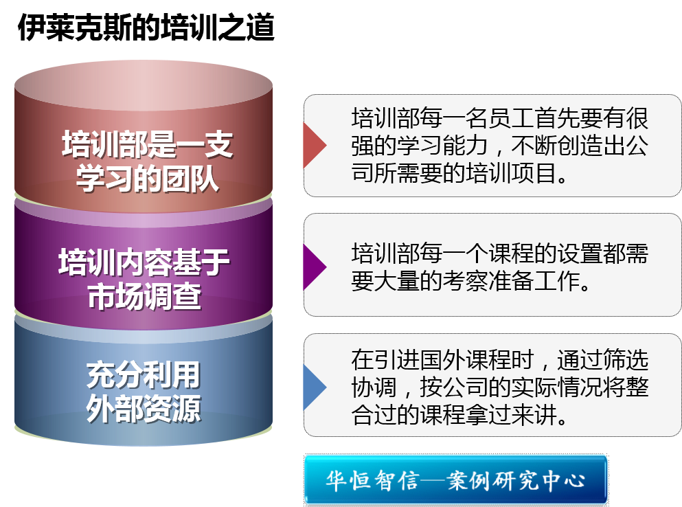 企业培训是一个系统的工程,任何一个环节出了问题,都难以收到成效。培训需求是建立有效培训体系的基础,通过多方市场调查全面分析员工的培训需求,并在此基础上设计的培训课程往往更具针对性和实用性。而且伊莱克斯还兼顾了培训的趣味性,寓教于乐,避免了员工参与培训难以投入的问题。培训还要考虑到成本与收益的问题,有效地整合内外部资源也是伊莱克斯能达到培训目标的原因之一。