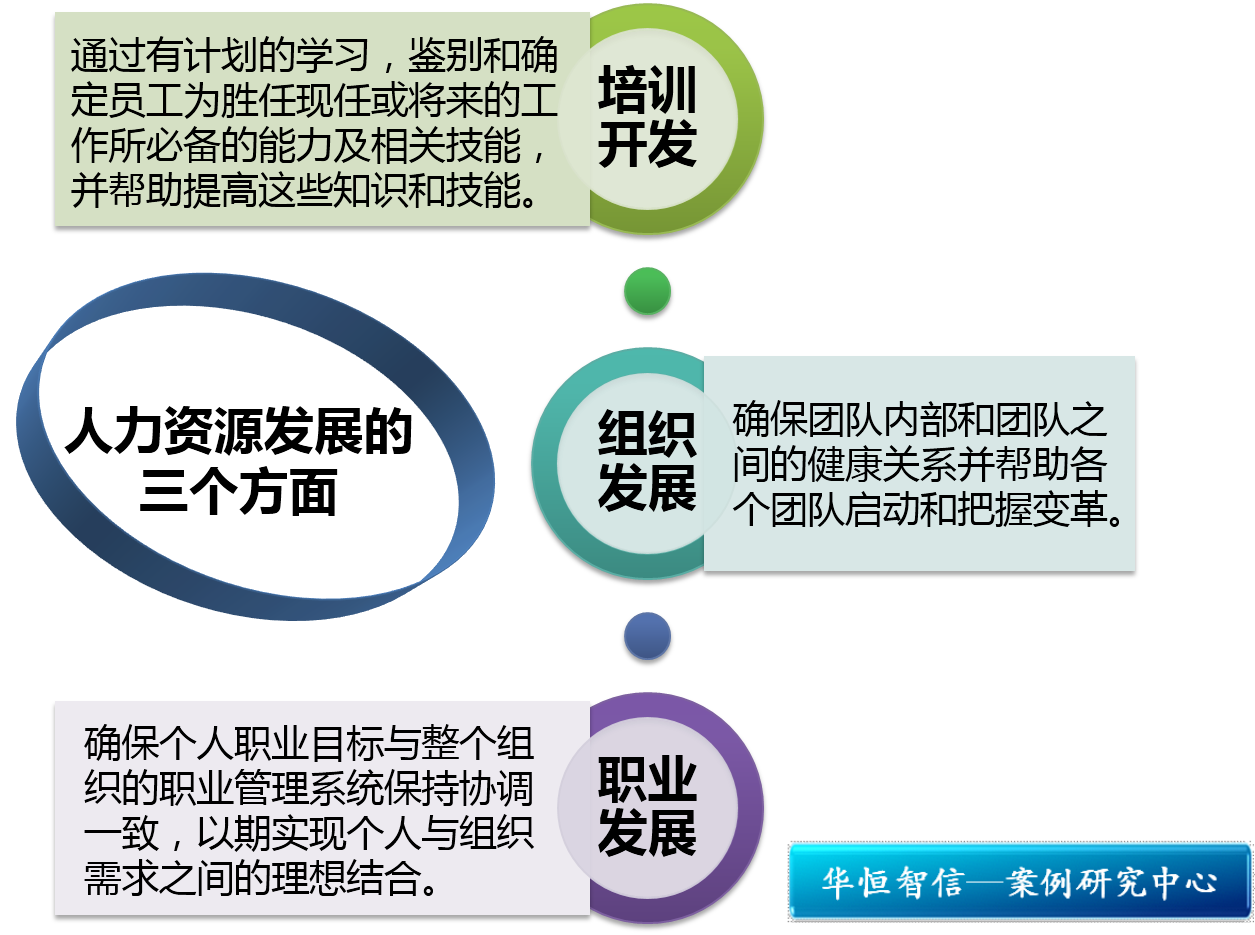 这个案例可说是点出了多数企业对人员培训开发的隐忧。而解决思路,正好应因了人力资源发展的三个方面:培训与开发、组织发展和职业发展。培训与开发的重点在于“通过有计划的学习,鉴别和确定员工为胜任现任或将来的工作所必备的能力及相关技能,并帮助提高这些知识和技能。”在这个定义中,关键词是“学习”和“个人”,旨在提升员工个人的综合素质。组织发展旨在“确保团队内部和团队之间的健康关系并帮助各个团队启动和把握变革。”“团队”是这个定义的关键词,组织发展主要目标是创建有利于员工在团队内充分发挥作用并实现团队之间高效合作的机制。职业发展的重点是确保个人职业目标与整个组织的职业管理系统保持协调一致,以期实现个人与组织需求之间的理想结合。职业发展不是直接针对员工的个人能力和他们的工作,也不像组织发展那样重点研究个体或团队之间的关系,其目的在于确保个人与组织需求之间的协调统一。