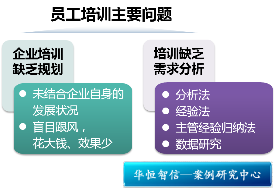 员工培训,是人力资源管理与开发的重要组成部分和关键职能,是组织人力资源资产增值的重要途径,也是企业组织提高效益的重要途径。当前企业在开展员工培训工作中,主要症结在于“投资多,成效少,培训力度大,培训效果差”的现象,企业管理者对此也十分困惑。华恒智信认为目前企业在员工培训中主要存在以下的问题: