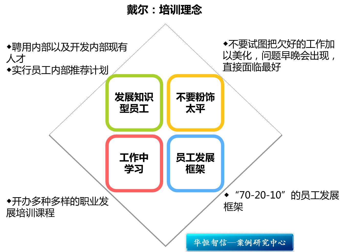 戴尔在培训办理方面的焦点内容是将重点放在员工的发展计划-“70-20-10”的员工发展框架,在这个体系中,他们会集中70%的员工通过工作经验来不断学习和提高,20%的员工通过辅导和指导提高自身,而另外10%的员工则进行正规学习计划。根据这一模型,10%的雇员的学习重点是在正式的课堂;他们的正规培训课程包括基本技术的培训和办理能力的培训,而重点放在领导力的培训上。另有20%的雇员的学习重点是接触不同领域的人和事,做跨领域的项目,比如鼓励员工参与BPI(业务流程再造);或者在公司内部不同部门寻找不同的教练。其余70%的员工则是在工作的过程中,学习经验再造的机会。