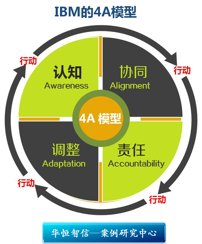 保证员工行为与公司目标一致是IBM传统的做法。达到这种目标的一种手段就是创造一个学习型的环境,使员工更快的学习知识并应用到工作中去。这些不是简单依靠传统的培训和对上司唯命是从就能实现的。让传统培训方式令人耳目一新的一种可行思路就是4A模型,即结合认知、协同、责任和调整四个方面来实现公司的宏伟目标,同时将人、流程和系统联系起来,强化正确的行为,不断调整,保证学习战略和人才培养始终如一地在其正确的道路上。