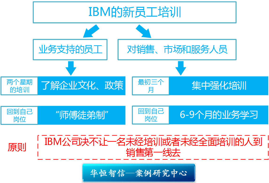 对新进入IBM公司的销售、市场和服务人员,则需要先经过3个月的集中强化培训,回到自己的工作岗位之后还要接受6-9个月的业务学习。