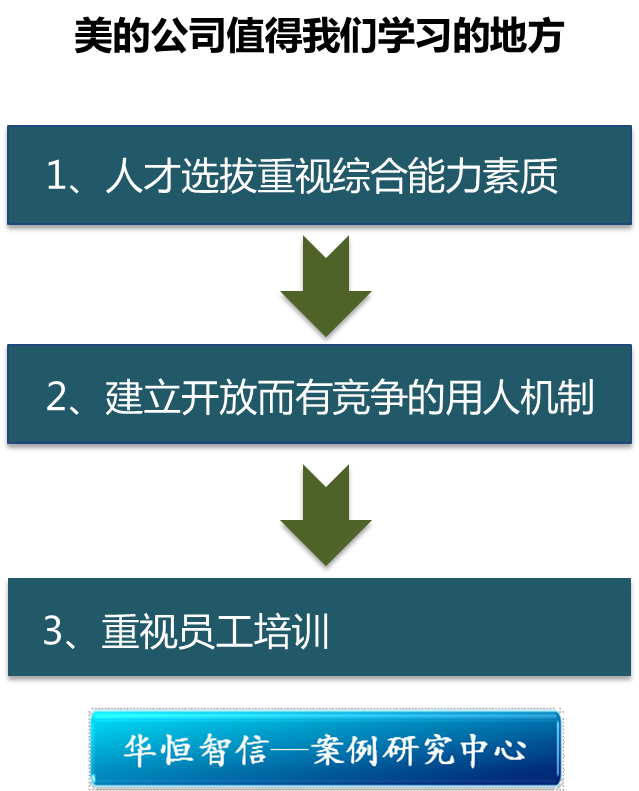 在广东美的集团,人才被看作是企业发展的第一资源,是企业发展壮大的决定性因素。几十年的发展,美的始终坚持这种人才理念,并在人才管理上不断探索,力图以优秀的人才管理实现企业的更大发展。而他的许多做法也是值得我们学习: