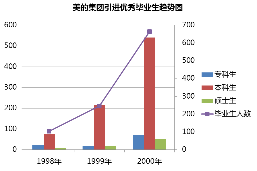 近年来,在激烈的人才争夺战中,美的集团更是加大了引进优秀毕业生的力度:接收应届大学毕业生的数量逐年递增,层次也逐年提高,1998年招聘毕业生104人,其中硕士8人,本科生74人,专科生22人;1999年招收毕业生246人,其中硕士16人,本科生214人,专科生16人;2000年接受毕业生的总量激增到665人,其中硕士51人,本科生541人,专科生73人。“美的”在全国17所重点院校设立“美的奖学金”,每年拿出60余万元奖励成绩优秀的在校生,既支持了教育事业,也扩大了在高校的影响。国内名牌高校毕业的MBA和其他能独当一面的人才,一进“美的”大门就可以享有年薪10万元人民币的优厚待遇,普通高校的上述人才也有8万元的年薪。