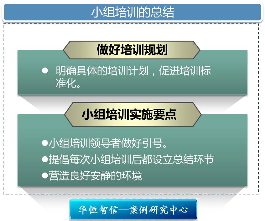 2,提倡每次小组培训后都设立总结环节。案例中富士康公司的小组培训,只在最后一次课程来一次总的总结,其实,每次小组培训之后都设立总结环节,培训效果会更好。特意地留出时间,让学员在学习之后及时思考,及时归纳总结,不仅可以加深学到的知识的印象,而且经过提炼的想法更易被学员在生活中实践运用。