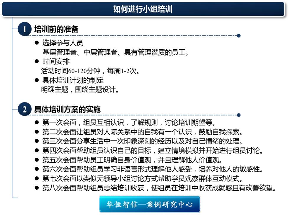 小组培训是一种比较新型的培训形式,虽然培训人数有限、培训成本较大、培训人员需具有一定特定背景和条件等等弱点,但是其在体验性和探讨性上具有显著优点,因此在企业中也逐渐开始被运用起来。上面是富士康公司提高人员的人际敏感性的一次具体培训案例,我们从中总结以下两点内容供大家学习: