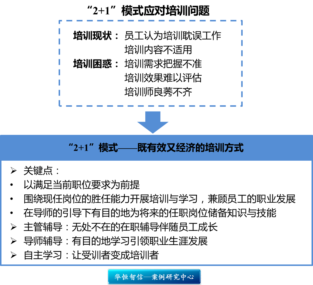 拥有一支高素质的人才团队也是每个企业的人才培养目标,增强员工的综合素质对企业应对全球化、高质量、高效率的工作系统挑战产生了重要的作用。培训是增强员工能力素质的重要方式。本文讲述了一种新型的培训模式“2+1”,重点是以满足当前职位要求为前提,围绕现任岗位的胜任能力开展培训与学习,同时兼顾员工的职业发展,在导师的引导下有目的地为将来的任职岗位储备知识与技能。这有效又经济的培训方式,正越来越被大多数的企业所采用。但是,目前企业在建立适合自己企业发展的系统化培训体系方面仍然存在着一些问题。对此,华恒智信分析员在总结相关知识的基础上提出以下观点。