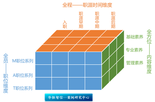 三全立体培训体系模型:全程——职涯时间维度(入职、职涯早期、职涯中期、职涯后期)+全员——职位维度(M职位系列、A职位系列、T系列)+全方位——内容维度(基础素养、专业素养、管理素养)