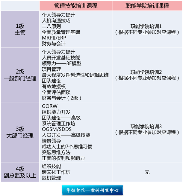 3级大部门经理(G.O.R.W、组织能力开发、团队建设-高级、系统管理工作坊、OGSM/SDDS、人员开发-高级技能、情境领导、成功人士的7个习惯、突破思维方法、正面的权利和影响力),4级副总监及以上(组织技能、跨文化工作坊、危机管理)