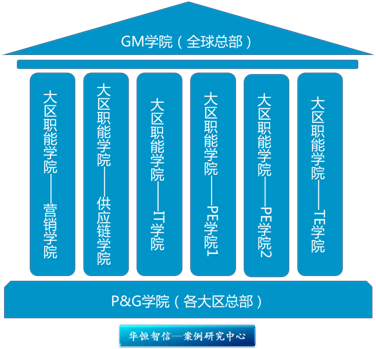 宝洁大学由全球总部的GM学院、全球总部职能部门的职能学院、各大区的P&G学院和大区的职能学院共同构成。宝洁在全球的每个大区都有一所P&G学院,每个大区中的职能部门都有自己的职能大学,因此,宝洁大学是由几十个学院构成的全球化的企业大学。下面具体介绍各个部门以及其功能: