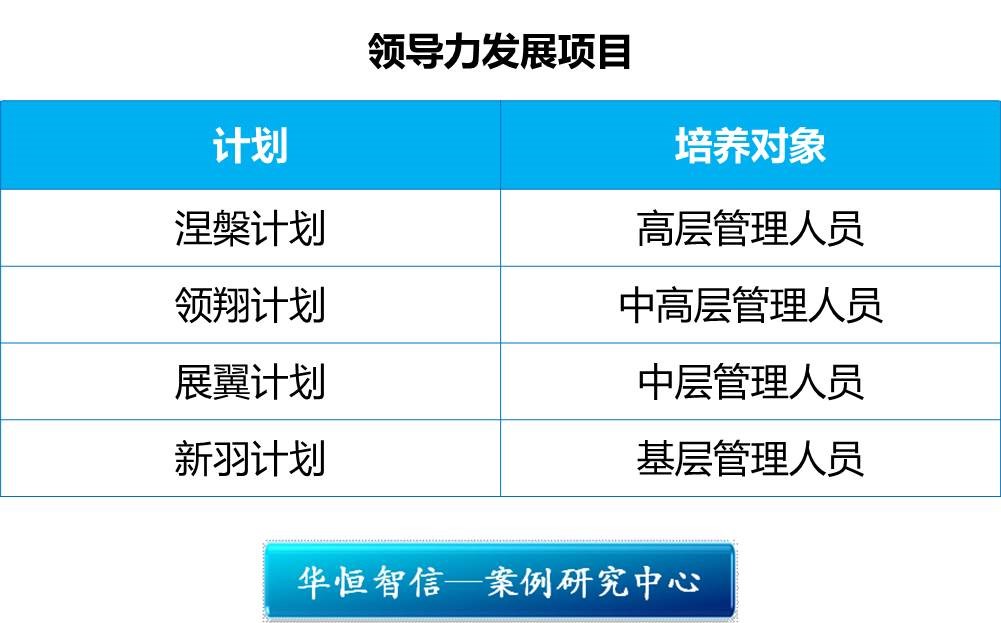 碧桂园集团的“领导力发展项目”,是一所打造职业经理人的“黄埔军校”,为公司全国化战略扩张提供高端人才。“领导力发展项目”针对碧桂园人才发展的四个不同阶段,即后备管理干部、中层管理人员、中高层管理人员及高层管理人员,制定了个性化子品牌计划项目——“新羽”计划、“展翼”计划、“领翔”计划和“涅槃”计划,创新了企业人才培养模式,形成了具标志性的企业培训项目品牌。四个计划涵盖了企业管理中不同层级,辐射了人才培养发展的不同阶段,全流程、长时段进行管理人才孵化与培养,为企业打造了一体化管理人才的培养模式。