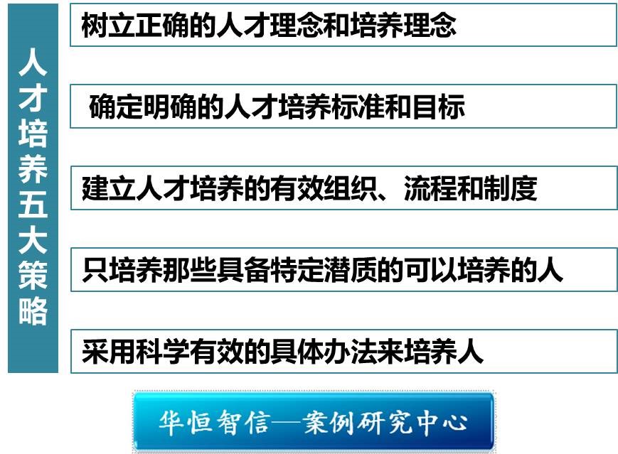 这篇文章结合众多大型企业的管理经验,综合性地提出了五个人才培养的策略,从理念、目标,到培养流程,到培养的针对性,再到科学有效的方法,为企业的人才培养提供了参考。但企业在确定人才培养的体系、制定策略时,仍然要首先考虑企业自身情况,不能盲目地借用其它企业的成功方式。华恒智信结合多年为企业进行人才培养咨询的经验,提出企业考虑自身特点,应注意以下方面: